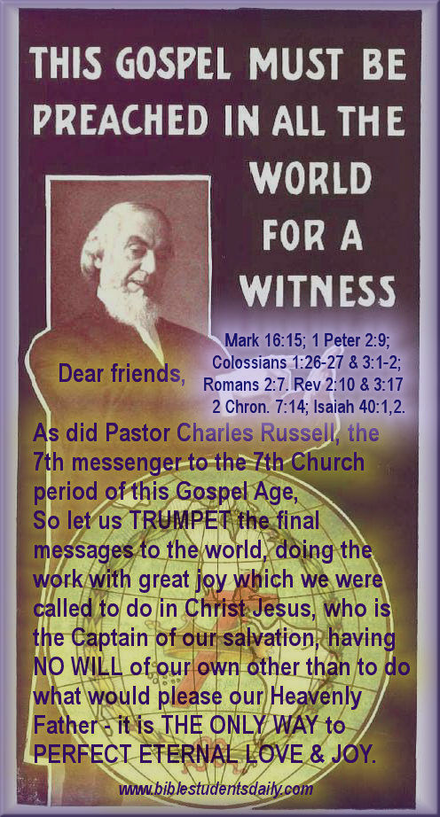 Pastor Charles Taze Russell -www.biblestudentsdaily.com Click to email a link to a friend (Opens in new window) Email Click to print (Opens in new window) Print Share on Tumblr Click to share on Reddit (Opens in new window) Reddit Pocket Click to share on Telegram (Opens in new window) Telegram Click to share on WhatsApp (Opens in new window) WhatsApp Tweet